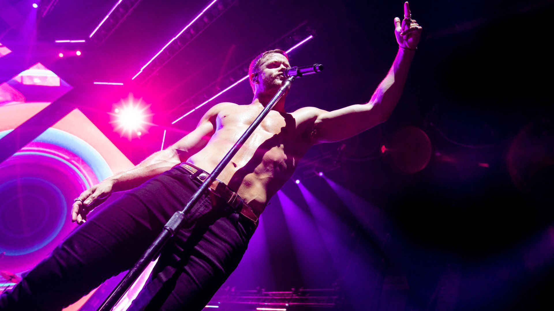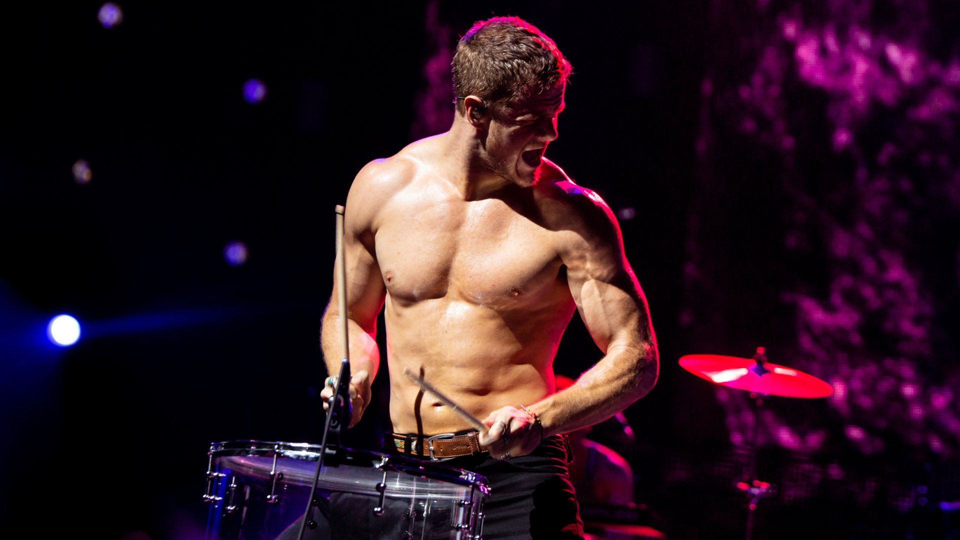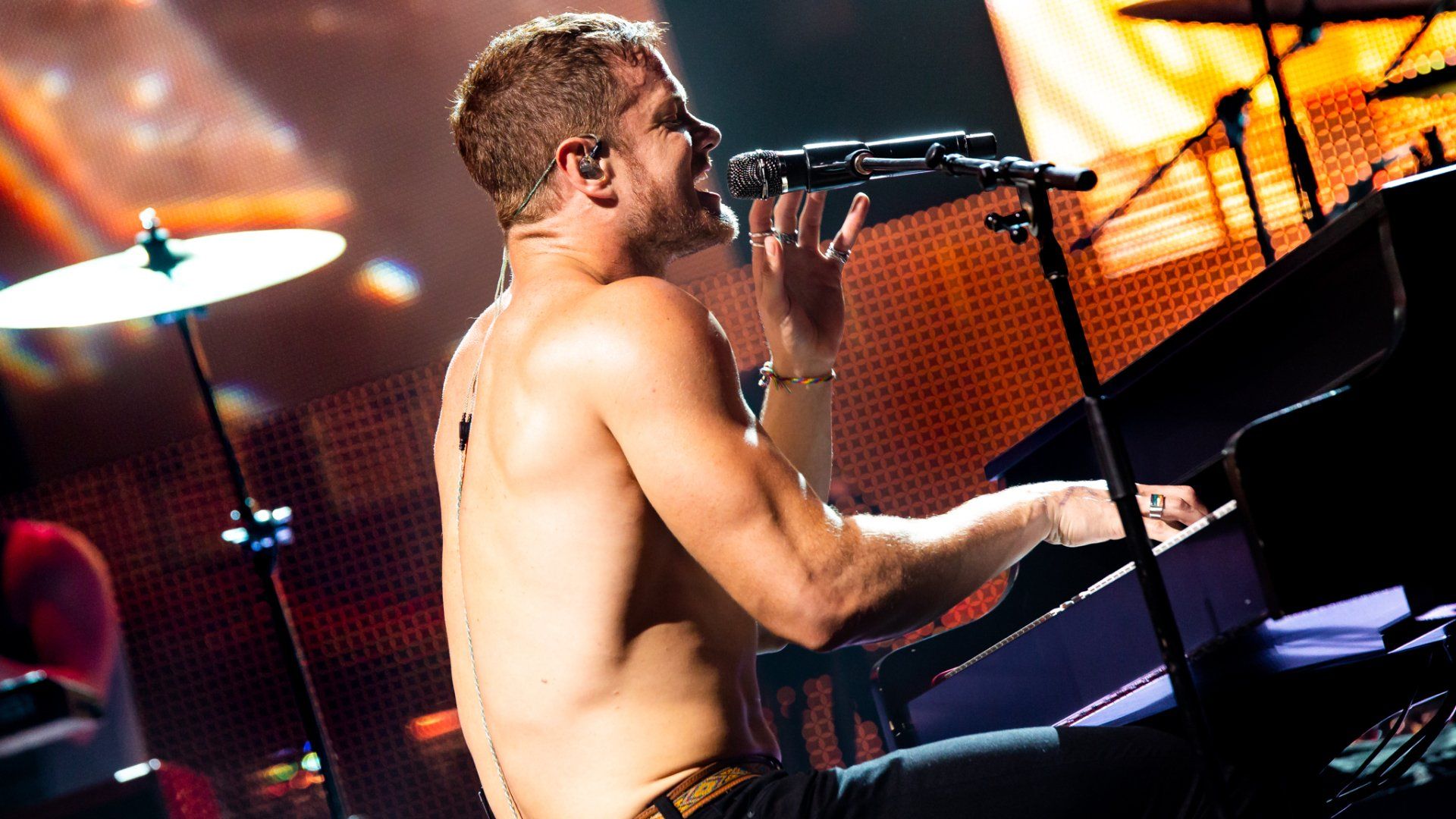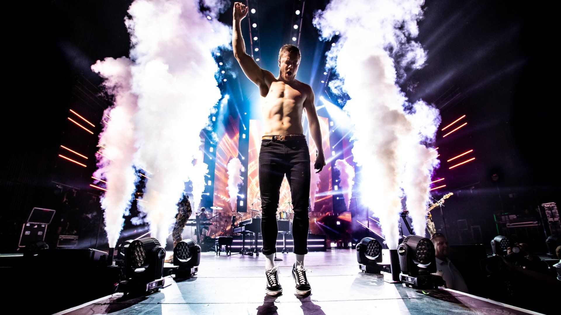 Imagine Dragons wasted no time that evening as the stage burst to life in orange light as the band rose from behind the drum kit as they played an original introduction to ‘Radioactive’ before Dan Reynolds came running down the thrust on the stage and Co2 burst around him to kick the night off in dramatic fashion. The band has come a long way their since Radio 104.5 debut under a white tent in the summer sun on a stage no bigger than a hundred square feet – though the fans remain the same as they jumped forward with joy from this first song to the last note of the last song. Reynolds took some time to both introduce the band and thank everyone including the radio station for coming to see them after the first song; it was then that he saw a fan in the front row holding a pride flag up that he reached out to grab for a few moments.