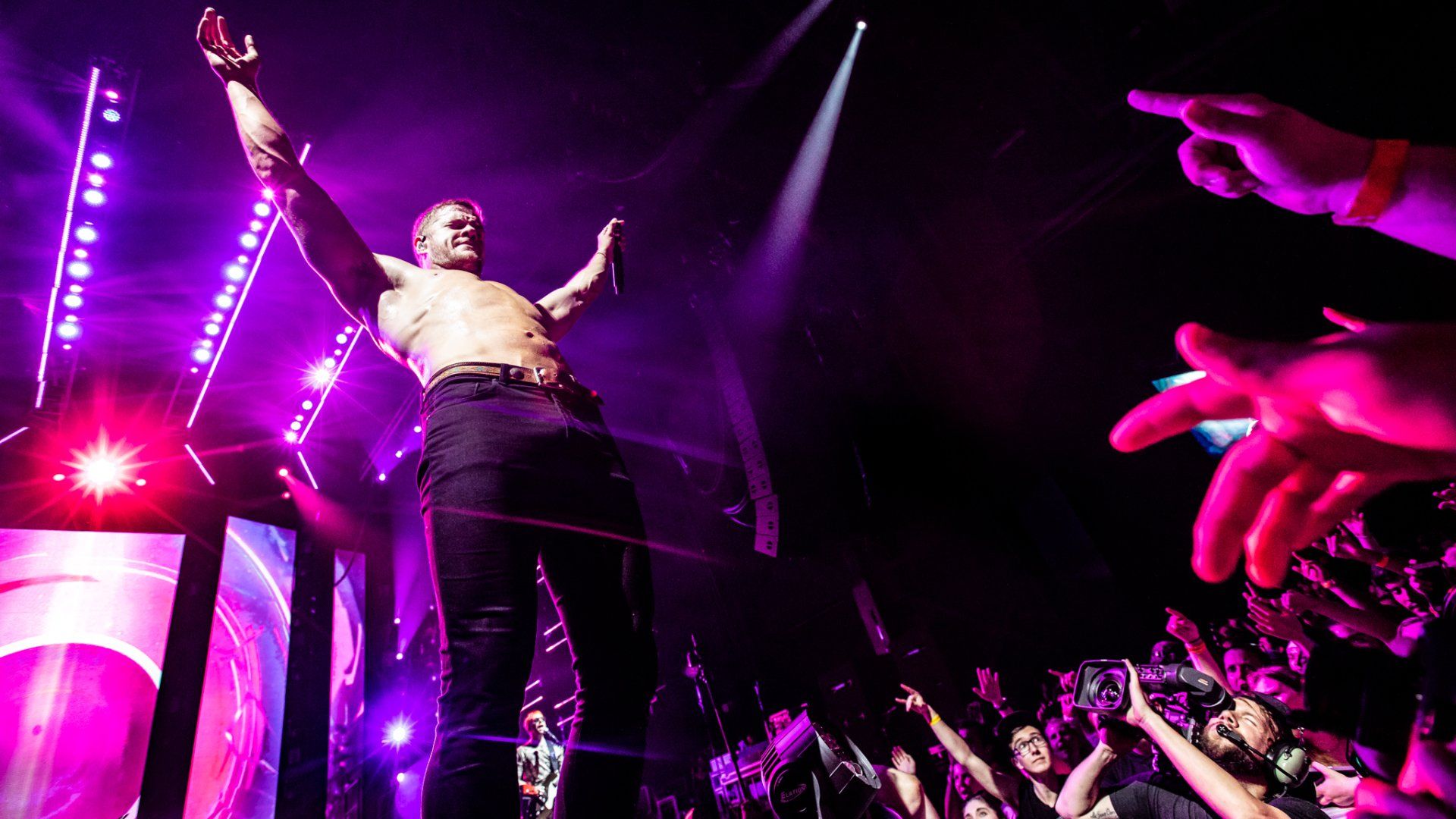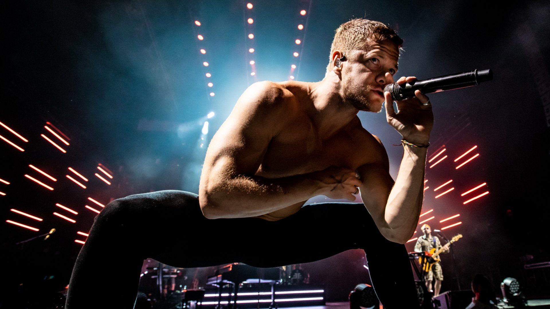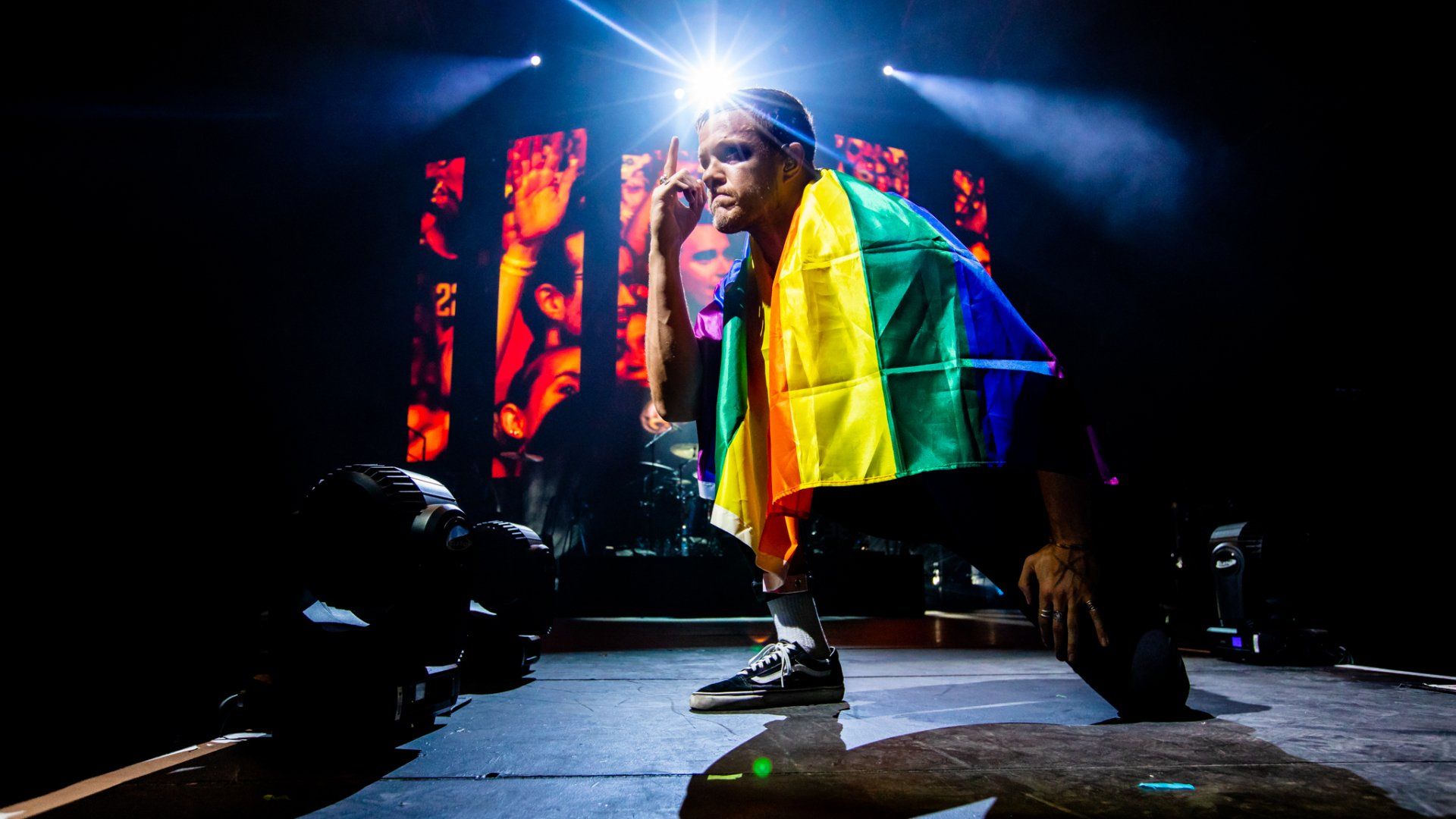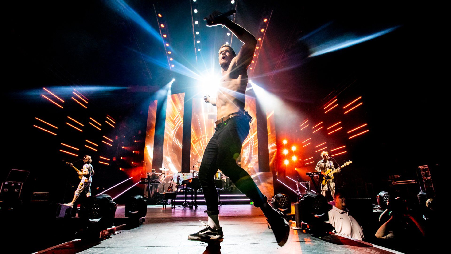 A brief but impactful message was delivered then as the crowd roared as Reynolds held the flag high above his head as he gave an strong message that asked for this concert to be a place of safety, inclusion and no judgement as fans were united by music. He kept the flag as he turned around to Wayne Sermon on guitar with a smile as they began a slow building version of ‘It’s Time’ to the approval of the crowd. Reynolds eventually went on to return the flag to it’s owner in the front of the crowded pit but the message remained the same all night long from the band and the show pressed on as Ben McKee on bass and Daniel Platzman on drums led the band into one of their more recent songs ‘Whatever It Takes.’