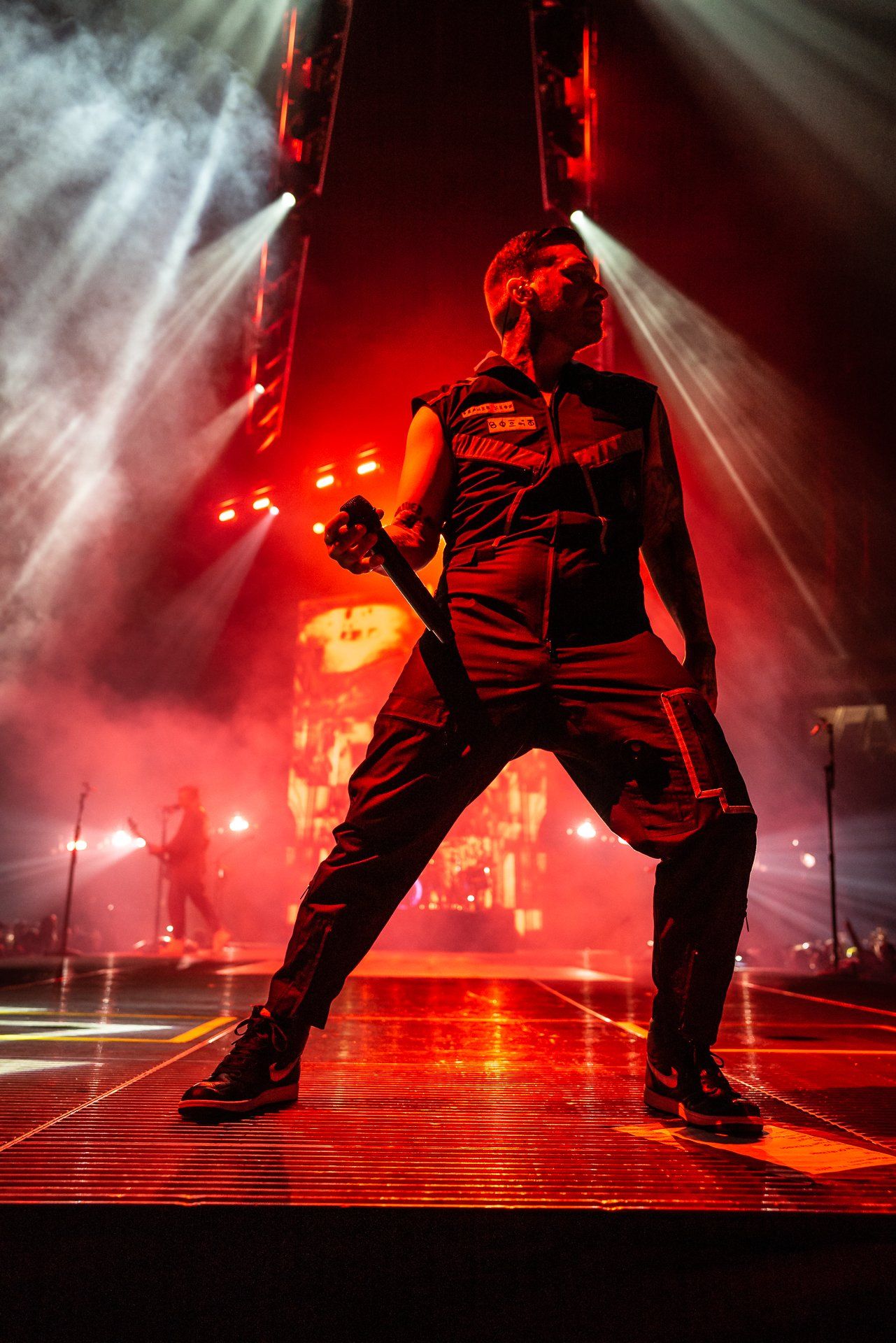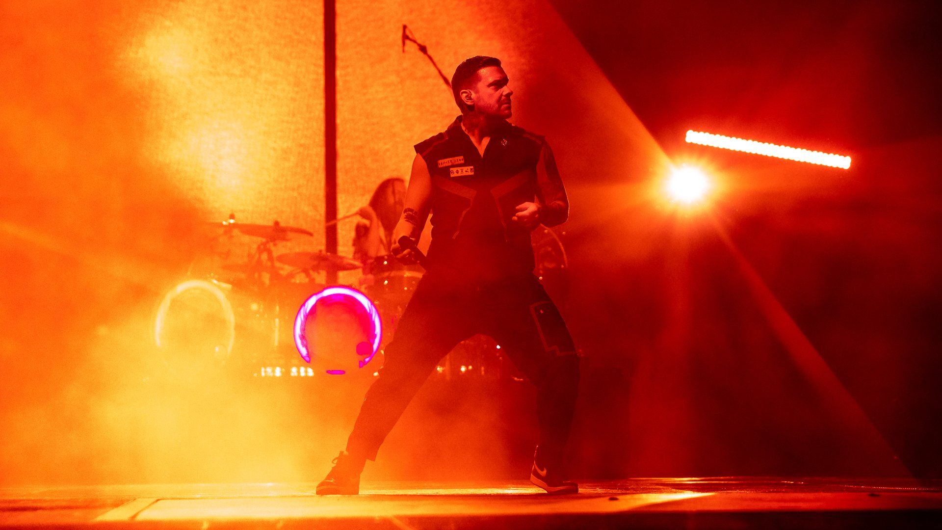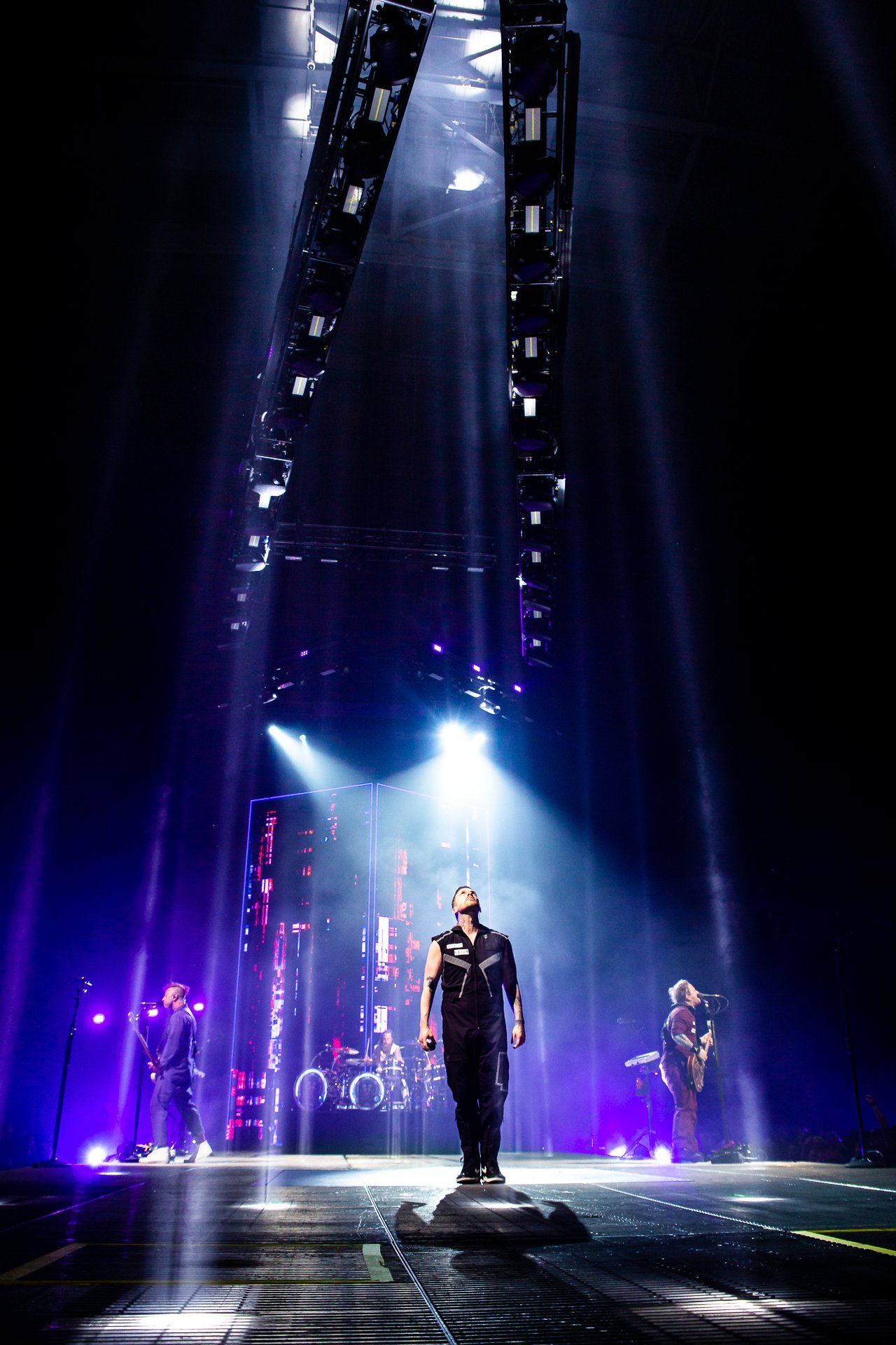 Shinedown arrived to the stage shortly past 9PM and their massive stage production slowly began to flicker to life. Prior to the band's dramatic walk out the sold out arena was transported back to 2019 as a video played on their massive video wall showcasing the tail end of the 'Attention! Attention! Tour.' However that video, much like our lives following, was cut short as it ended 2020 and the pandemic began - from there things progressed until 2021 when the video (and the night) took a thematic turn. Cryptic alien symbols flashed on the screen, an AI appeared and the Giant Center was taken from 2022 and transported to "Planet Zero" as Shinedown emerged from behind their video wall and kicked the show with their new song "The Saints of Violence and Innuendo."