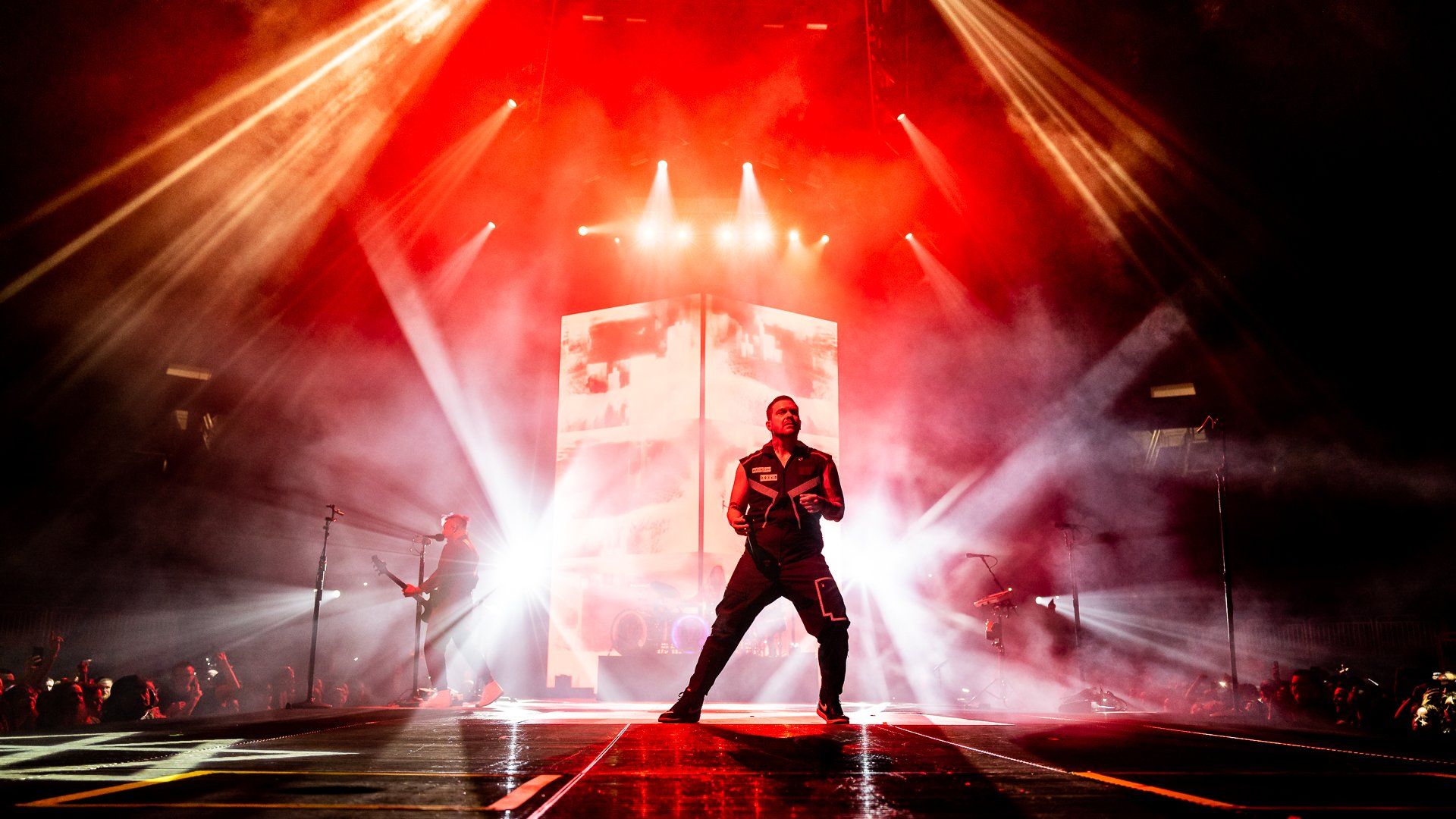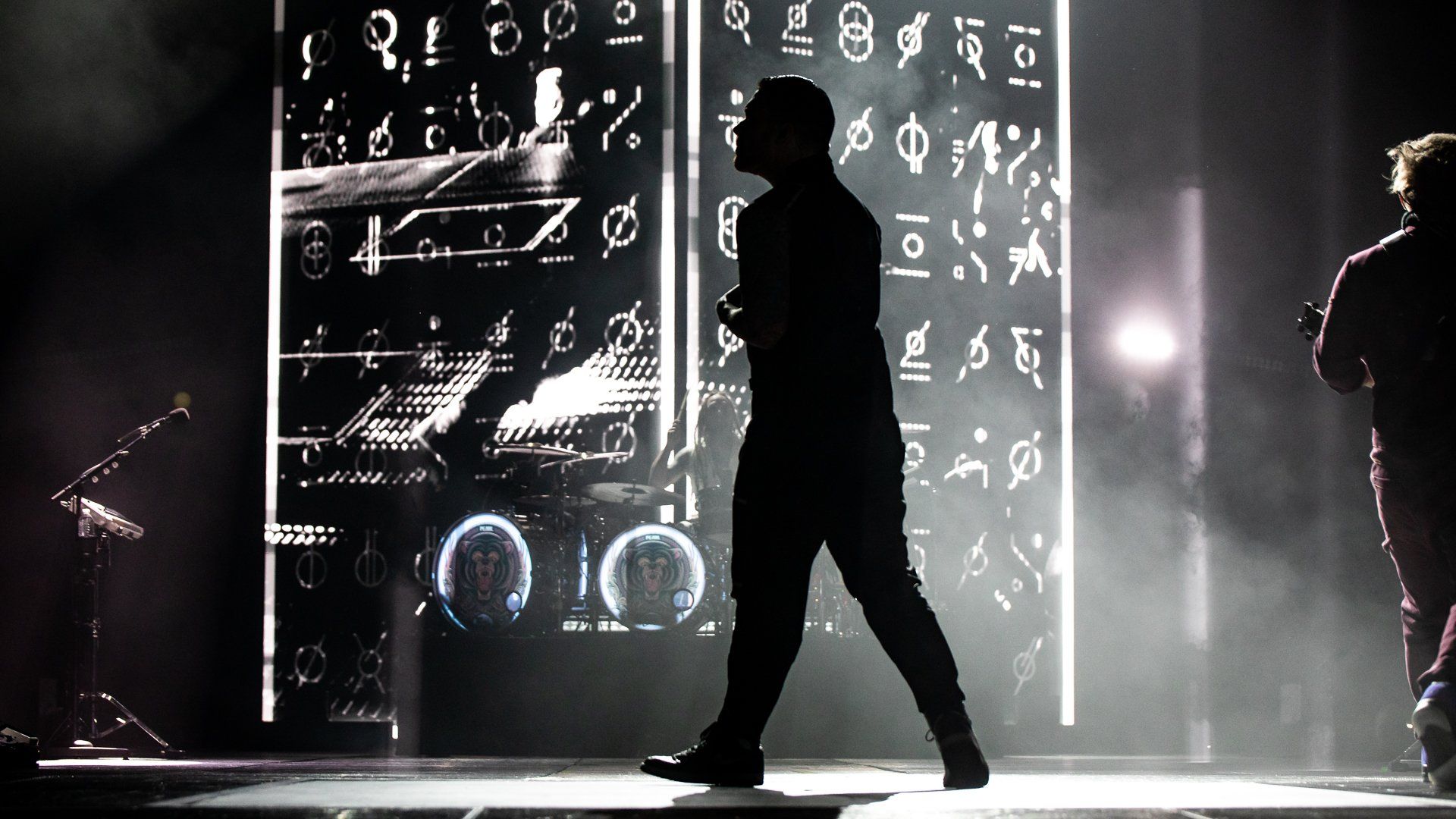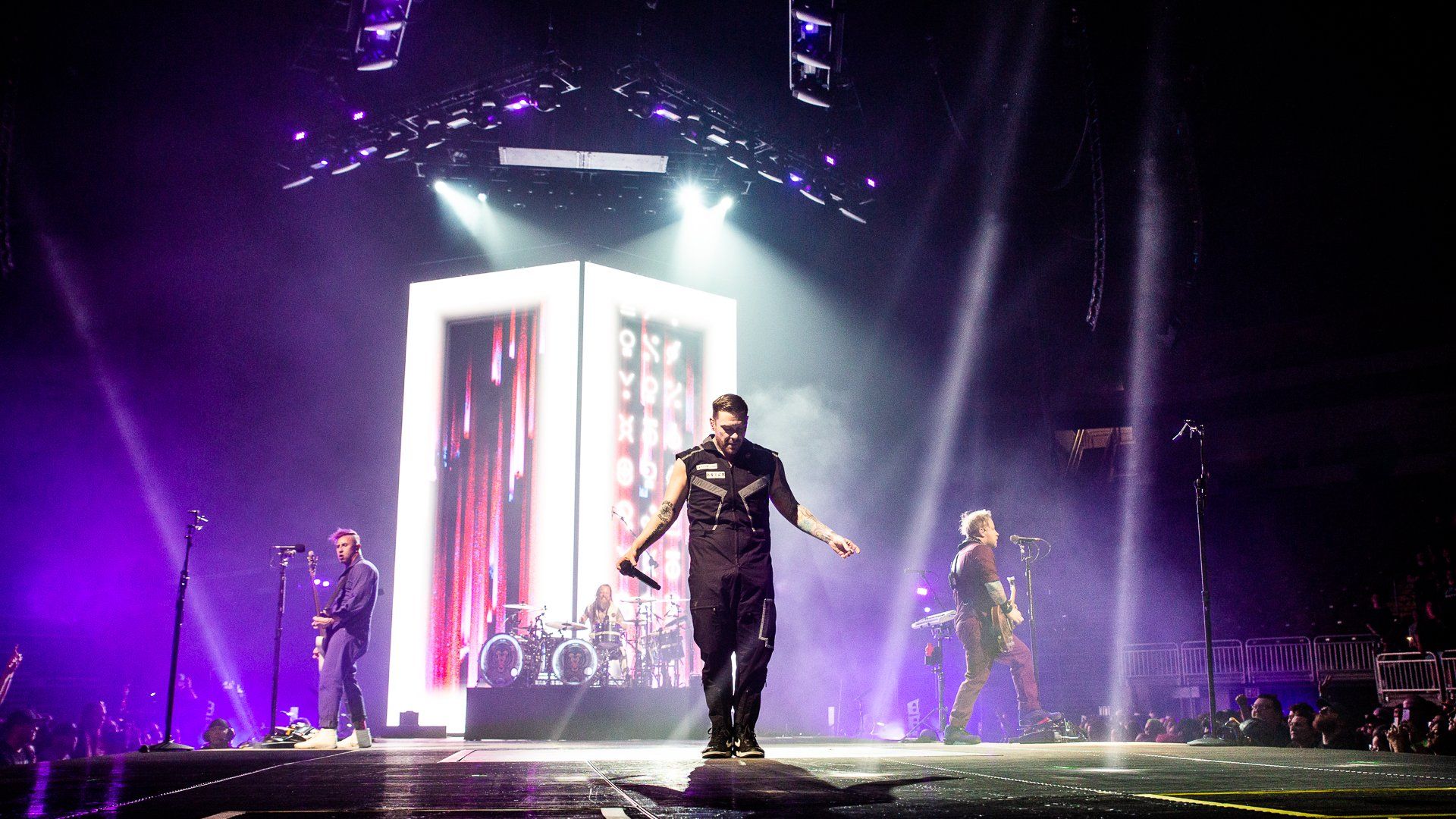 Shinedown arrived to the stage shortly past 9PM and their massive stage production slowly began to flicker to life. Prior to the band's dramatic walk out the sold out arena was transported back to 2019 as a video played on their massive video wall showcasing the tail end of the 'Attention! Attention! Tour.' However that video, much like our lives following, was cut short as it ended 2020 and the pandemic began - from there things progressed until 2021 when the video (and the night) took a thematic turn. Cryptic alien symbols flashed on the screen, an AI appeared and the Giant Center was taken from 2022 and transported to "Planet Zero" as Shinedown emerged from behind their video wall and kicked the show with their new song "The Saints of Violence and Innuendo."
