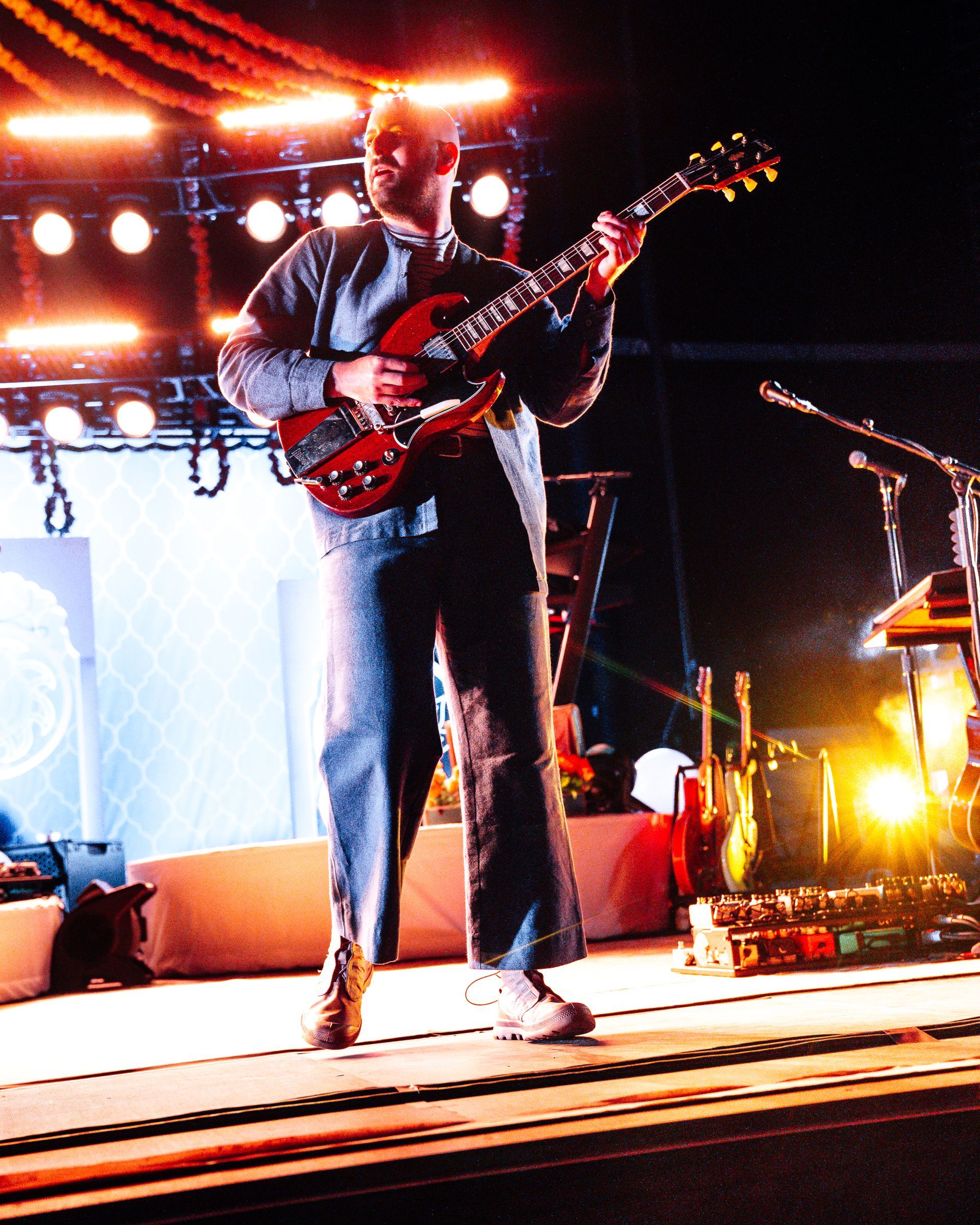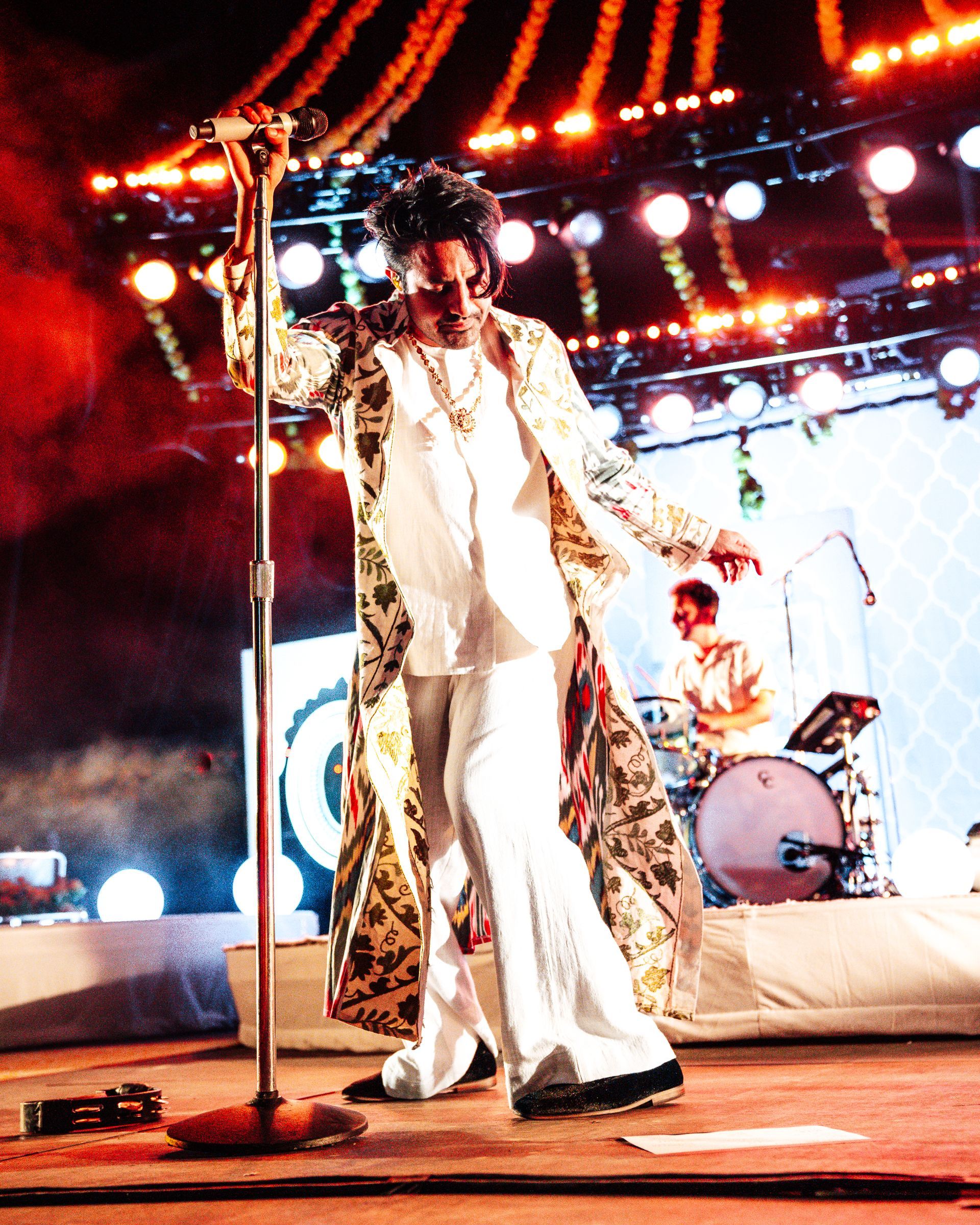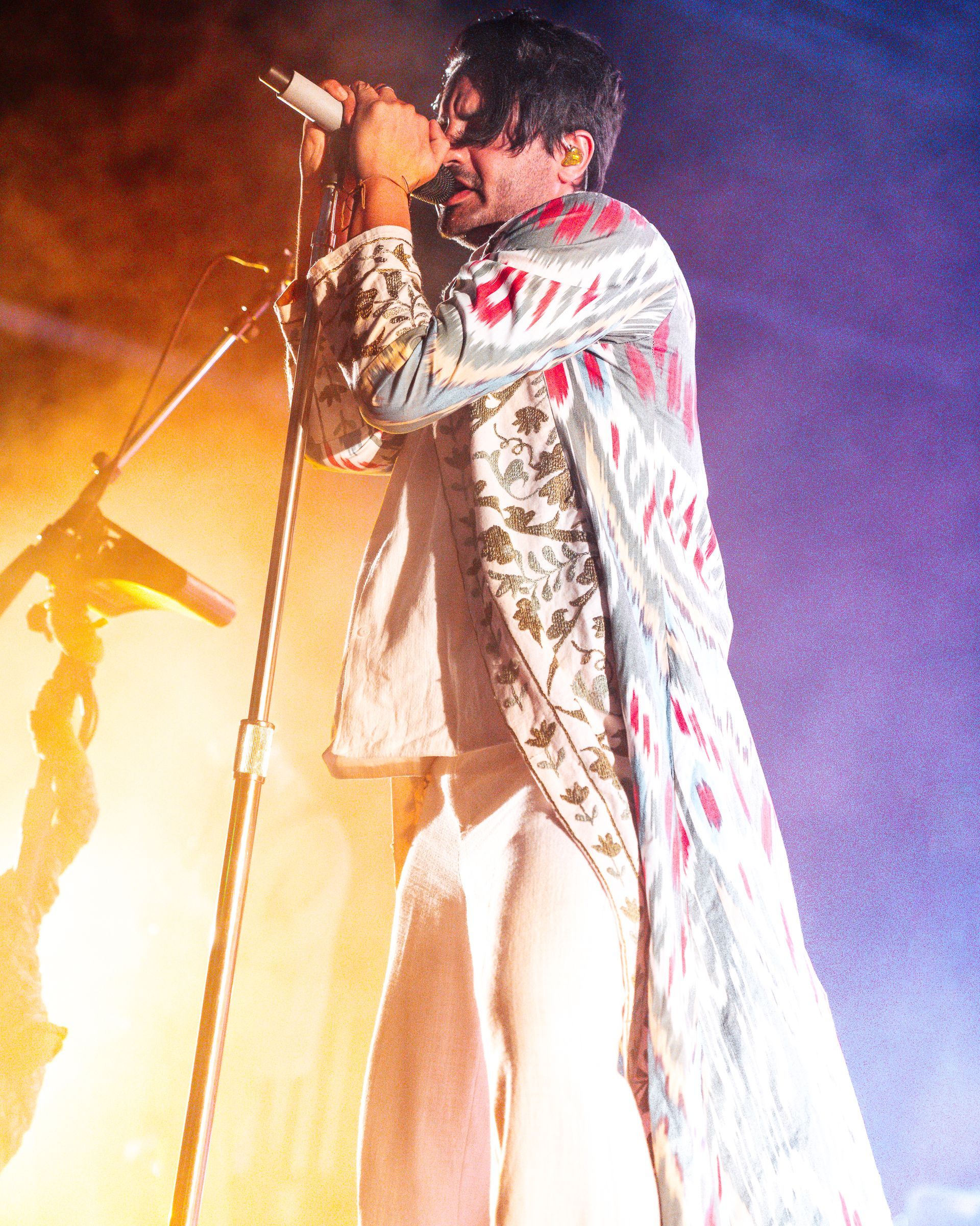 By the time night fell across the city of Philadelphia the Mann Center had already witnessed two of the best sets it may host all summer with another yet to come as the stage was transformed in the spirit of "American Bollywood" for the arrival of Young The Giant. The band emerged on stage amidst a dramatic purple wash that hid them from few until late in title track that kicked the night off but the mysterious antics soon faded. In a shock to all Young The Giant kickstarted their set with a rapid fire succession of hits that barely left the packed crowd a chance to catch their breath as they ran through "Wake Up," "Something to Believe In" and "Cough Syrup" back to back.